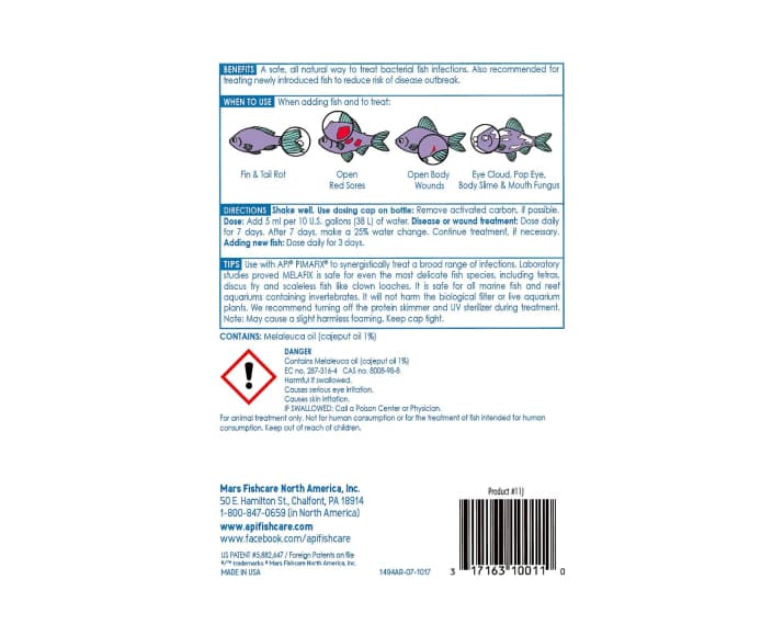 Treat bacterial infections in your fish and reduce the risk of spreading illness to other fish with API Melafix for Healing Bacterial Infections. Bacterial diseases are caused mostly by dirty aquarium conditions and the addition of infected fish. Fish that are injured and have open wounds are especially susceptible, even in seemingly clean tanks.