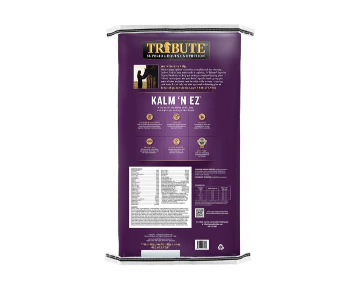 Nourish your equine friend with superior-quality nutrition by feeding her Tribute Kalm ‘N EZ Horse Feed! This pelleted horse feed doesn’t contain corn, oats or molasses, which makes it low in non-structural carbohydrates (NSC).